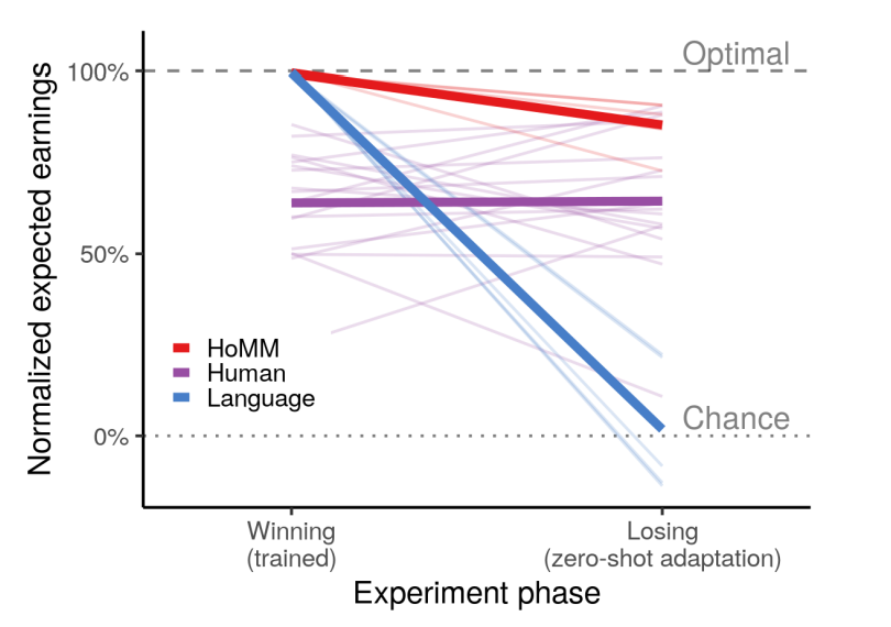 The results are solid across domains. In poker, for example, the model efficiently switches from winning to losing the game, without ever having trained directly on 'losing'.